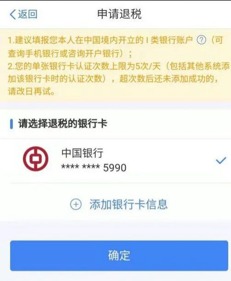 6.最后選“下一步”--“申請(qǐng)退稅”--“確定”--“選擇銀行卡”--“完成”。